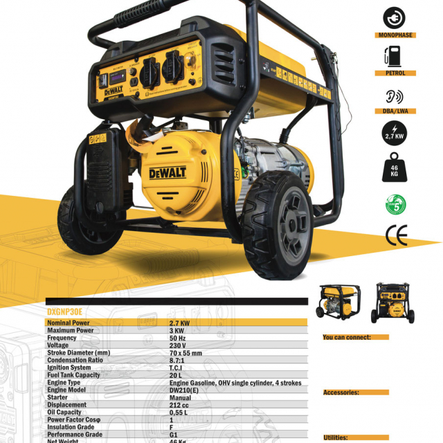 The DEWALT DXGNP30E generator is a powerful and reliable generator with a powerful 212cc petrol engine. With a maximum power of 3000W and operating voltages of 230V, this generator is an excellent choice for demanding applications on construction sites or, for example, emergency power supply where a reliable power supply is required.