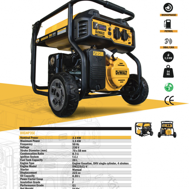 The DEWALT DXGNP35E generator is a powerful and reliable generator with a powerful 223cc petrol engine. With a maximum power of 3500W and operating voltages of 230V, this generator is an excellent choice for demanding applications on construction sites or, for example, emergency power supply where a reliable power supply is required.