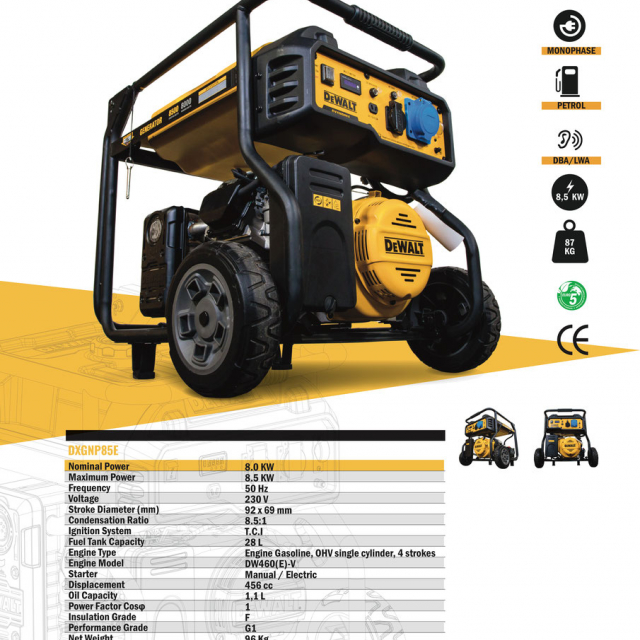 The DEWALT DXGNP85E generator is a powerful and reliable generator with a powerful 456cc petrol engine. With a maximum power of 8500W and operating voltages of 230V, this generator is an excellent choice for demanding applications on construction sites or, for example, emergency power supply where a reliable power supply is required.