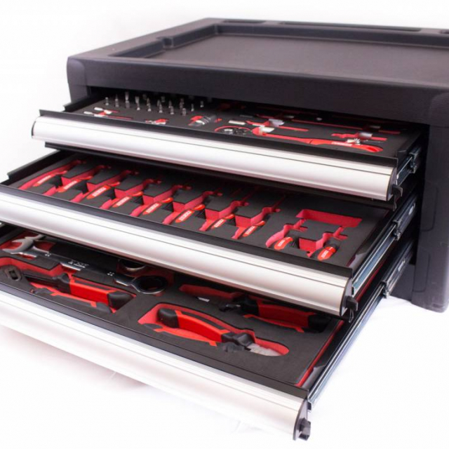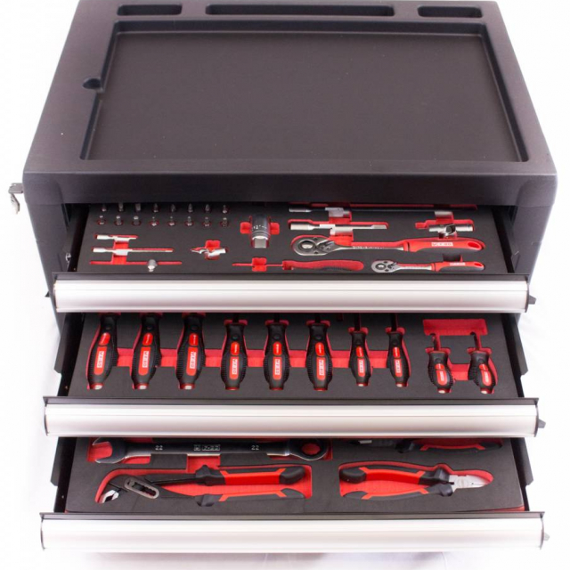 Aan de zijkant van de gereedschapskist zit er een gatenbord,dat is erg handig voor het ophangen van uw gereedschap.U heeft hierdoor altijd het juiste gereedschap bij de hand. De lades hebben een afmeting van 55 x 39,5 x 6 cm en zijn volledig uitrekbaar. Alle lades zijn door middel van de meegeleverde sleutel op slot te zetten. Aan de bovenzijde van de kist is er plek voor gereedschap, bouten of moeren. Het plateau bestaat uit 3 ruimtes met verschillende formaten en is ook te gebruiken als werkblad.Kortom, deze gereedschapskist beschikt over allerlei snufjes die handig zijn voor het klussen. De topkist is ook uit te breiden met één van de Ragnor gereedschapswagens. Deze gereedschapskistwordt inclusief gereedschap geleverd.