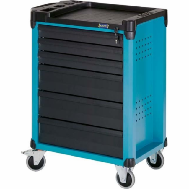 stevige plaatstalen constructie, schuifladen met kogelkorfgeleiding, midden- en eindblokkering en afzonderlijke vergrendeling tegen onbedoeld openen bij het rijden. De basisuitrusting bevat een tussenschot per schuiflade. De zijwanden hebben een vierkant gatenpatroon, waardoor de aanbouwdelen worden ingetrokken en binnen de wagen aangebrachte zijwanden tegen beschadigingen worden beschermd Centraal afsluitbaar met cilinderslot. Werkblad van oplosmiddelbestendige kunststof, met vakken voor kleine onderdelen en labels. Met grote, stevige kogelgelagerde wielen (Ø 125 mm), 2 zwenkwielen, eenzijdig met wielrem (totale stop) voor een vaste stand in alle richtingen. Alle wielen hebben lagerbeschermers tegen vuil en draden. Randbeschermers boven en onder aan alle vier de zijden van de wagen. Randbeschermers boven en onder aan alle vier de zijden van de wagen. Oppervlak met krasvaste poedercoating, corpus in.-blauw, schuifladen in zwart.